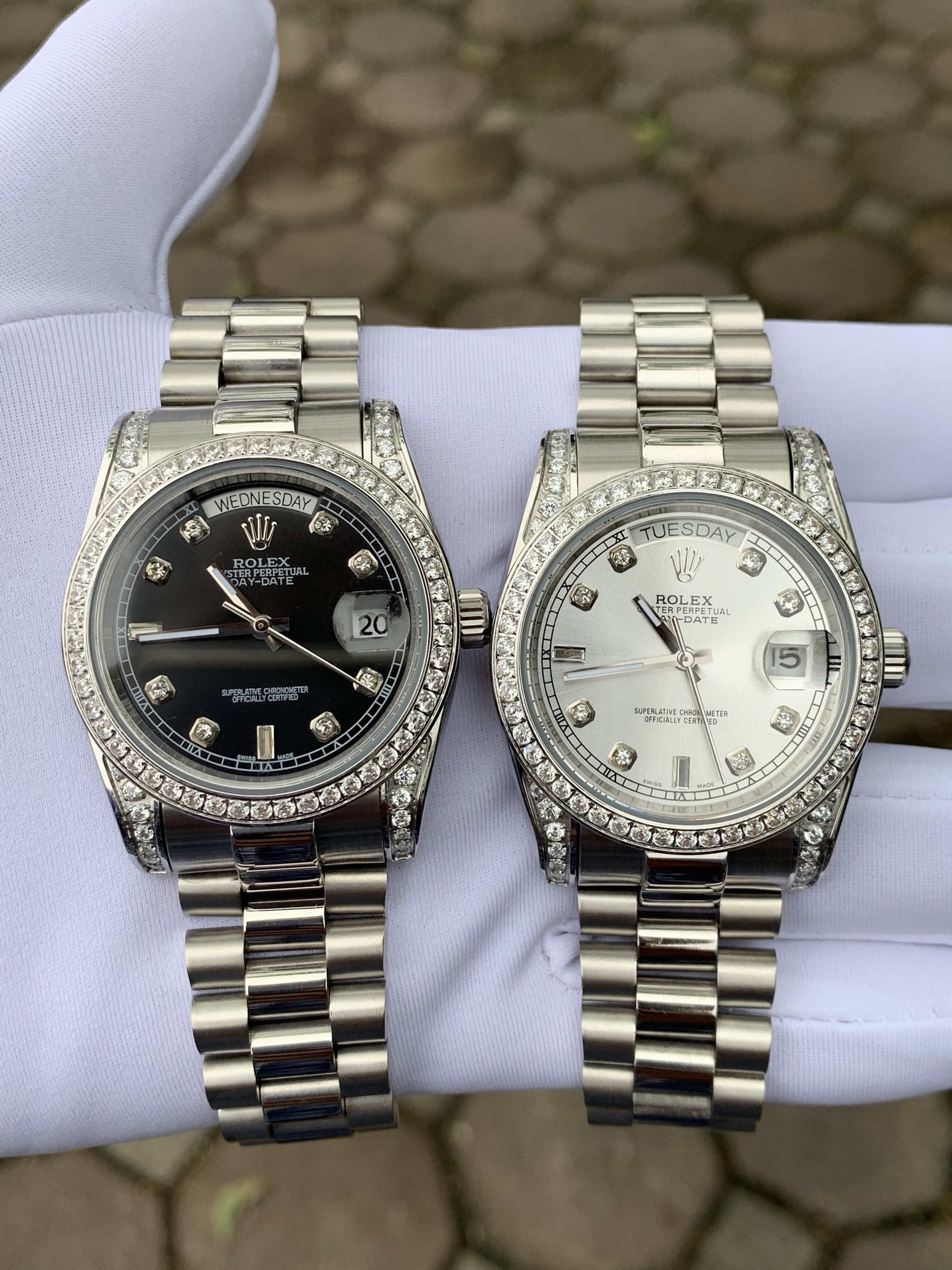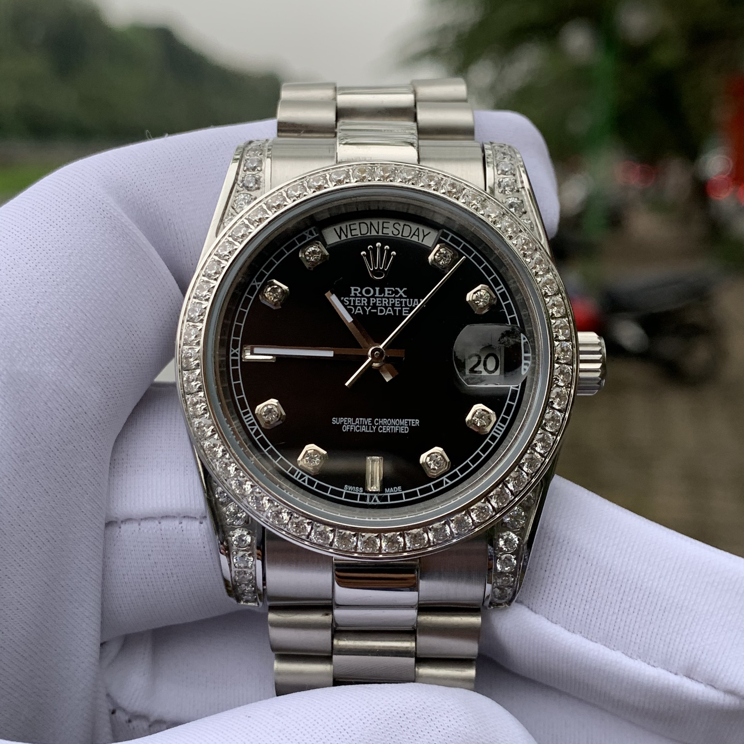 - Đồng hồ Rolex nam máy cơ dòng Rolex Day-Date thiết kế các vạch số đính đá nổi bật chạy kèm lịch ngày