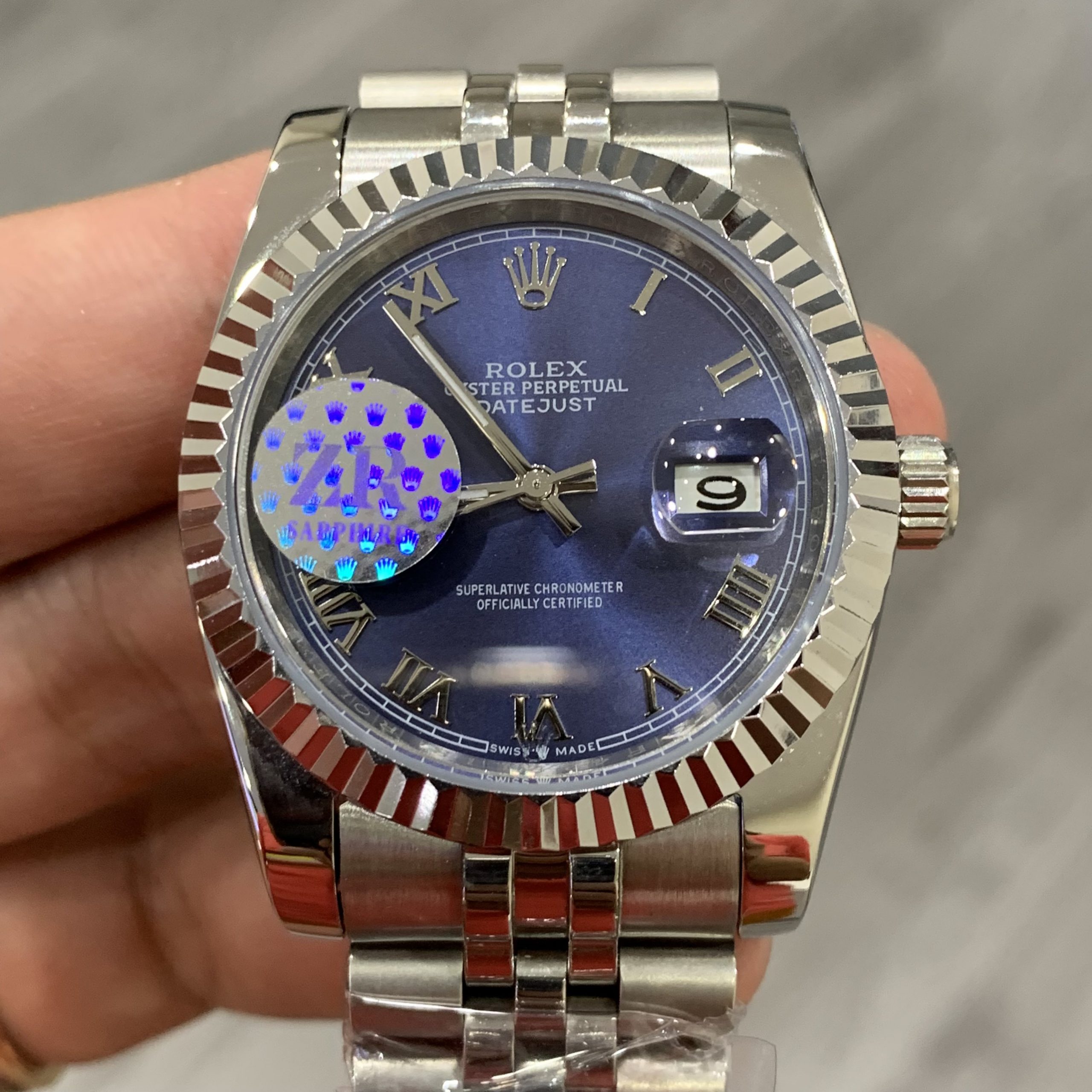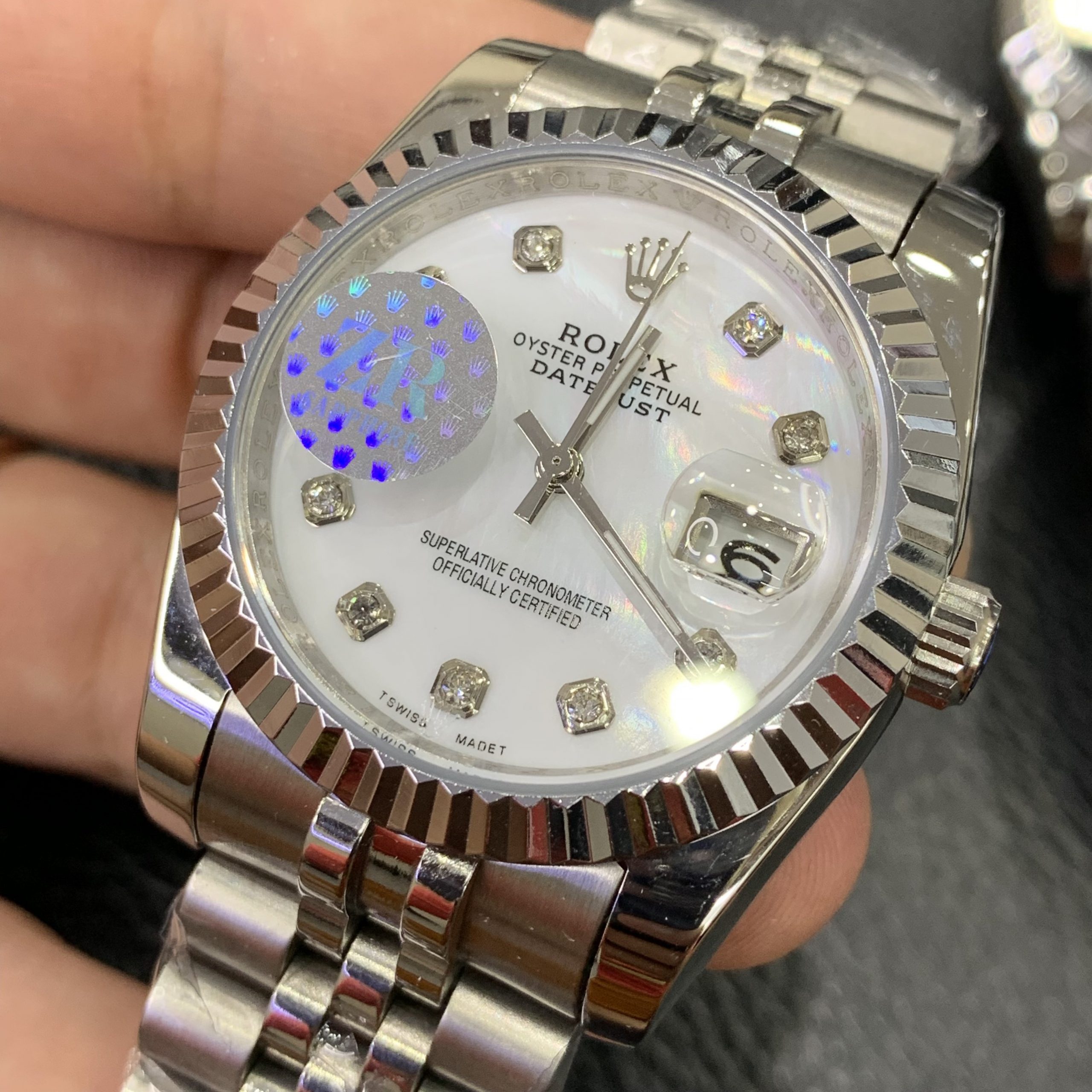 - Đồng hồ Rolex nam máy cơ dòng Rolex DateJust thiết kế các vạch số đính đá nổi bật chạy kèm lịch ngày