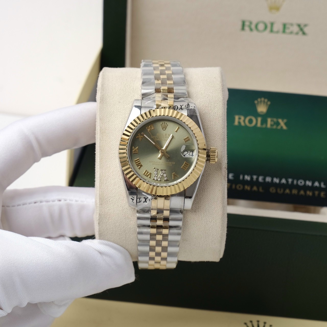 - Đồng hồ Rolex nữ DateJust Super Fake 1:1 Nhật sử dụng mặt kính khoáng cường lực tráng Sapphire giúp chống trầy xước tốt